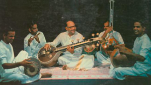 カルナティック音楽の演奏風景-中央の楽器はシタールによく似た弦楽器ヴィーナ
